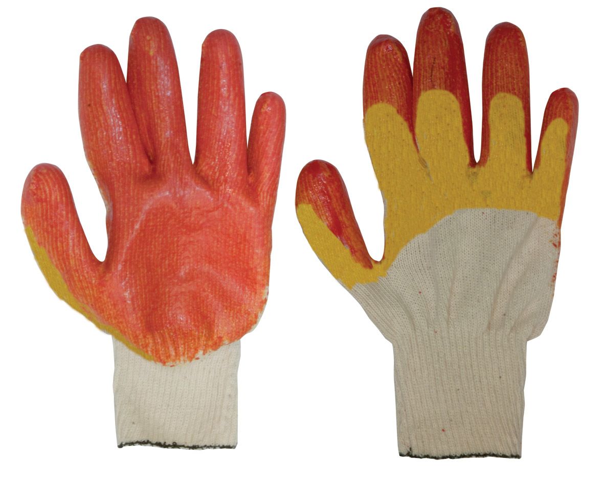 Для строительных и погрузо-разгрузочных работ. Ладонная часть усилена двойным слоем латекса. Защищают от порезов, проколов, заноз. Повышенная износоустойчивость. Материал: х/б основа, латекс.